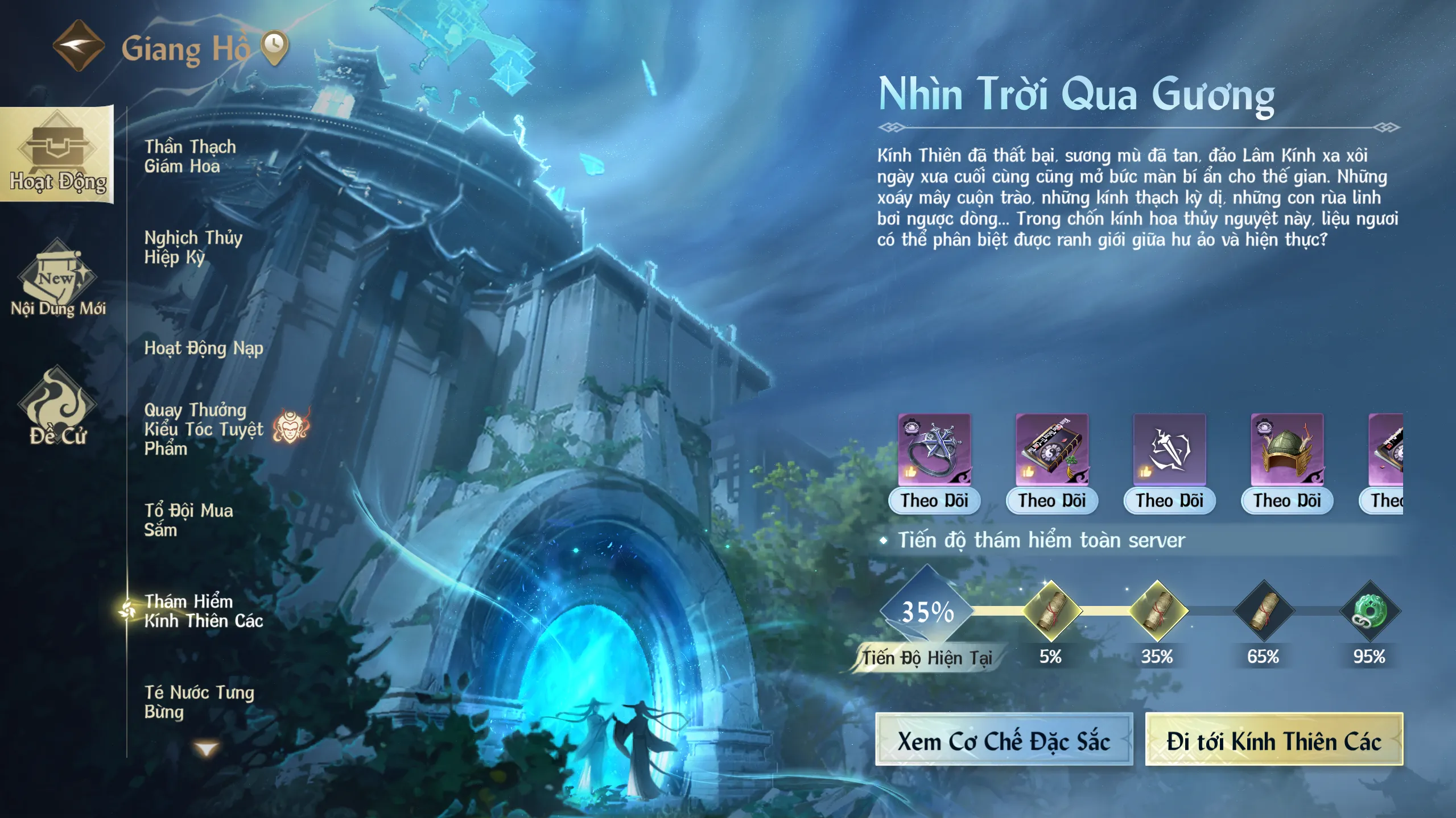 Sau bảo trì cập nhật ngày 30/03, chính thức mở map mới [Kính Thiên Các], với cơ chế và nội dung thám hiểm mới lấy「Kính」làm trọng tâm. Thám hiểm Kính Thiên Các, sẽ nhận được trang bị Độc Trân [Thiên Nhận Dung Phong Giới], kỹ năng giang hồ [Kim Cang Thông Tí-Cứu Thế], nội tại tự do, ngoại trang bất ngờ và nhiều thưởng khác!