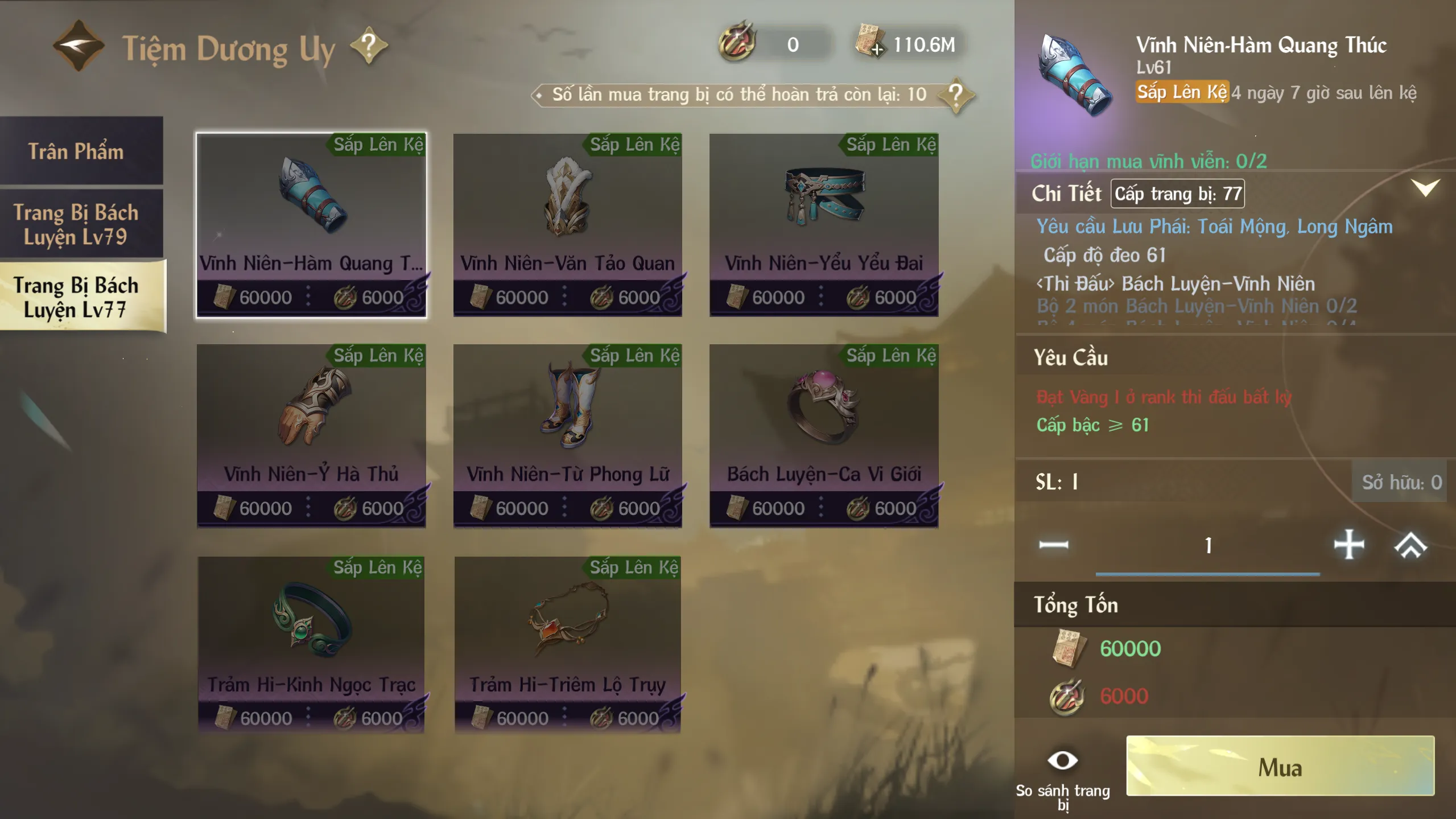 2) Cập nhật đổi tại Chợ-Trang Bị, có thể đổi trang bị tím cấp 77. Sau khi đạt thời gian mùa giải tương ứng, có thể tiêu hao Lệnh Hàn Quang và Ngân Phiếu để đổi trang bị Bách Luyện cấp 77, 79, 81.