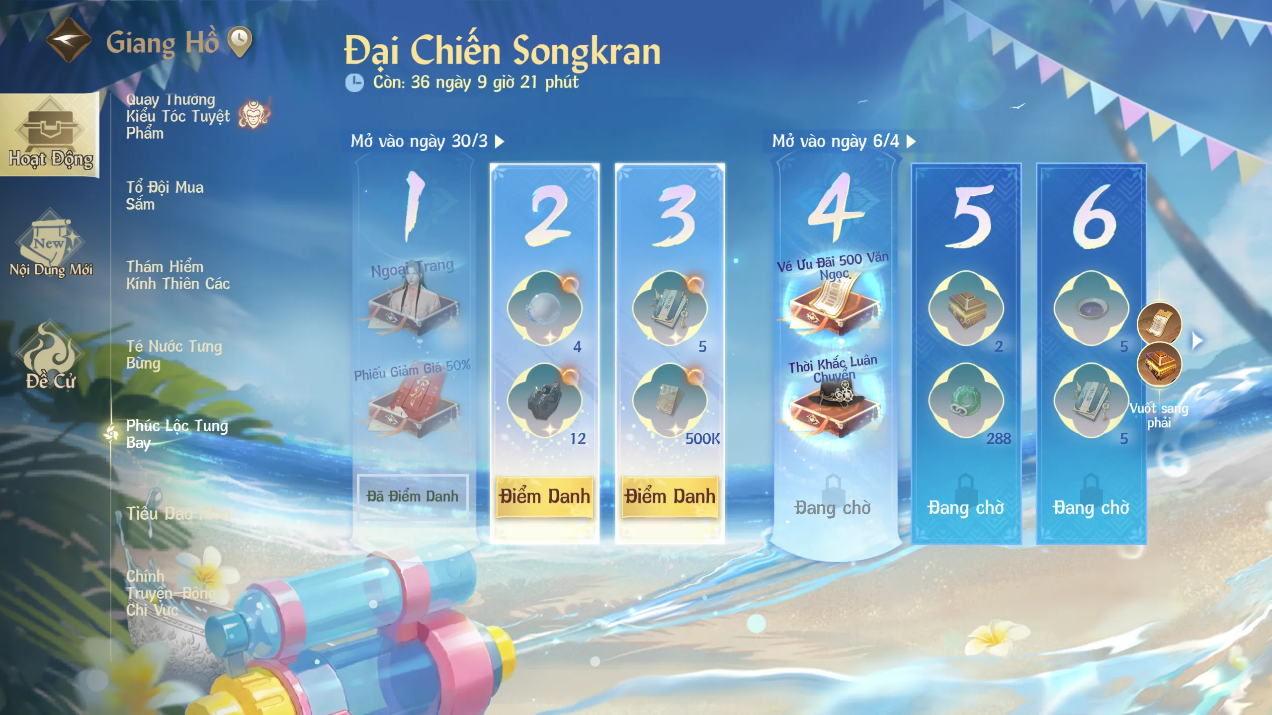 Từ ngày 30/03 đến ngày 08/05, có thể tham gia hoạt động điểm danh tại [Hạn Giờ-Phúc Lộc Tung Bay]. Tổng thưởng được chia thành 3 tuần để nhận, mỗi tuần chỉ cần điểm danh 3 lần là có thể nhận đủ thưởng tuần đó. Tích lũy điểm danh có thể nhận được các phần quà như [Phiếu Giảm Giá 50% Ngoại Trang], Ngoại Trang [Xuân Chi Ẩm Vũ], Vé Ưu Đãi 500 Văn Ngọc, Vé Ưu Đãi 300 Văn Ngọc-Hạn Giờ (Sau khi 1.2.2 kết thúc sẽ hết hạn), Nhuộm Ngọc Hoa, Phụ Kiện [Thời Khắc Luân Chuyển], Nội Công-Hiếm-Trích Tiên Lôi Ngâm, v.v.