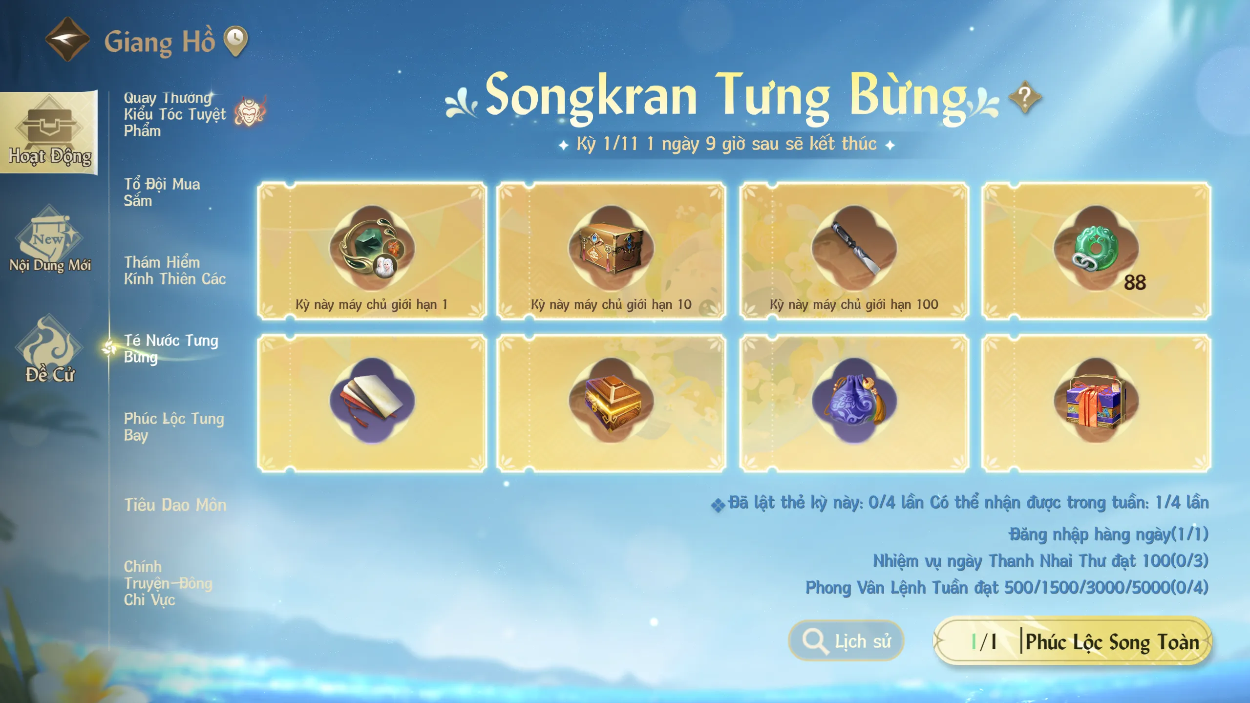 Trong thời gian diễn ra hoạt động, tiêu hao Văn Ngọc mua các loại hàng hóa thông qua nhiều kênh chỉ định trong game sẽ được tính vào Tiến Độ Cá Nhân. Tích lũy Tiến Độ Cá Nhân có thể nhận được các phần thưởng theo từng giai đoạn như Avatar [Đại Hội Songkran], Khung Avatar [Khuấy Đảo Toàn Sân], Phụ Kiện-Cẩm Sư Hiểu cùng Vé Ưu Đãi Văn Ngọc v.v.
