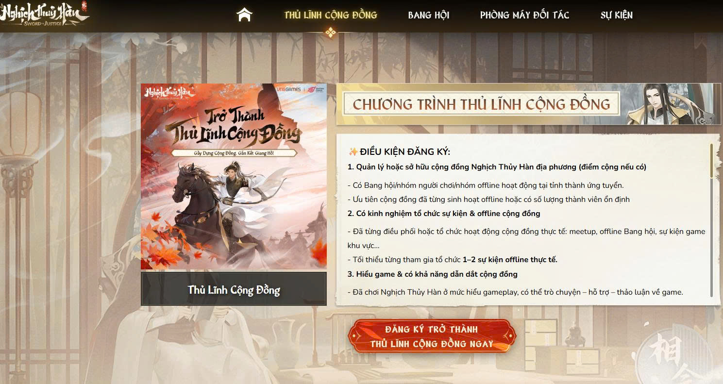 Thủ Lĩnh Cộng Đồng là những cá nhân nổi bật hỗ trợ cho Nhà Phát Hành trong việc tìm kiếm, phát triển và gắn kết mạng lưới cộng đồng người chơi Nghịch Thủy Hàn tại các tỉnh thành/địa phương mà mình hoạt động.