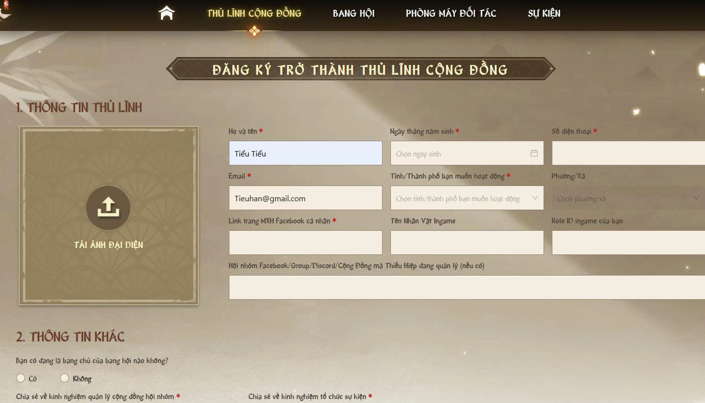 Bước 3: Tại trang đăng ký thông tin tham gia, Thiếu Hiệp hãy điền các thông tin theo yêu cầu để Tiểu Hàn có thể hiểu rõ hơn về mình. Sau khi điền xong, hãy bấm vào nút “Đăng Ký Trở Thành Thủ Lĩnh Cộng Đồng”