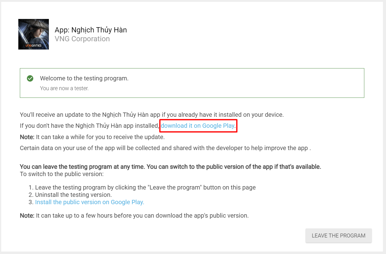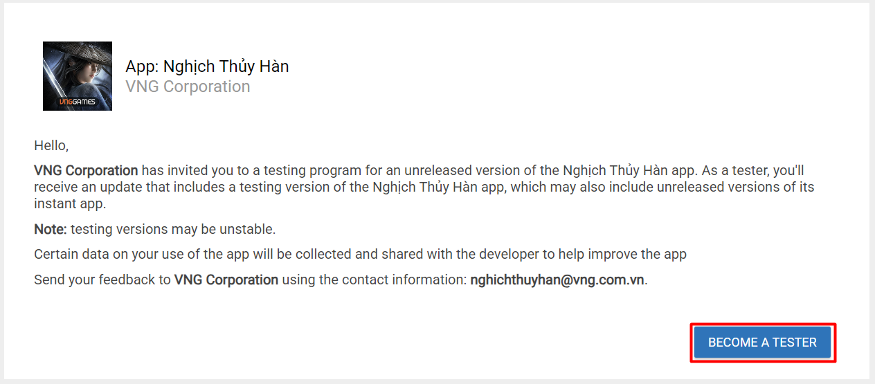 Nhấp vào sẽ dẫn đến trang xác nhận → Chọn “BECOME A TESTER” → sau đó bấm “Download it on Google Play” để vào Google Play tải game.