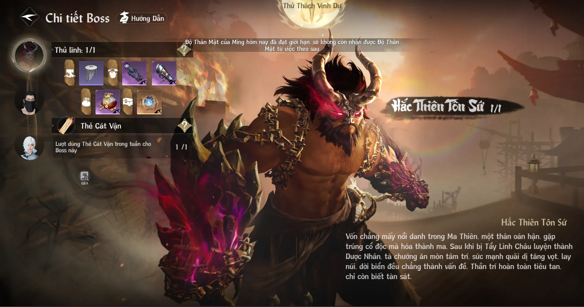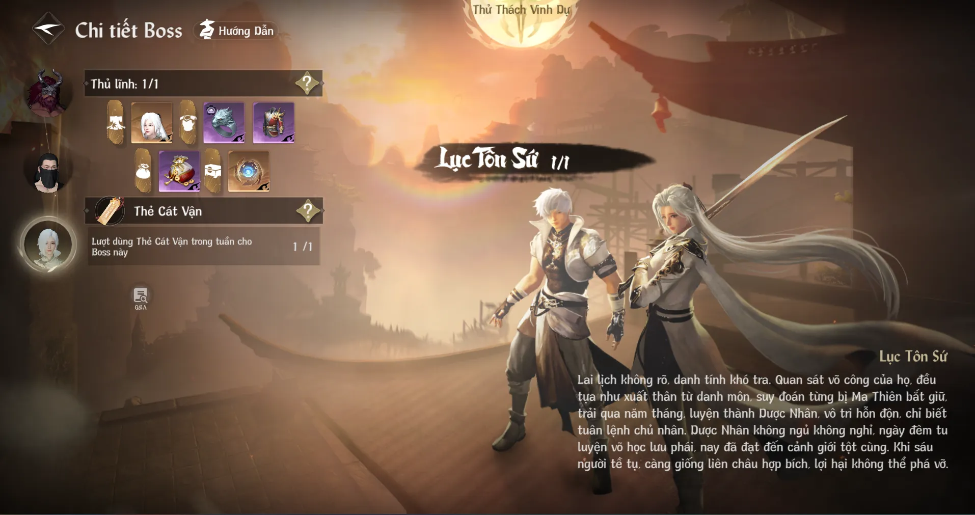 Nếu Boss 2 là bài “thủ thành”, thì Boss 3 là bài “đội hình”: sáu Tôn Sứ vốn xuất thân danh môn nhưng bị Ma Thiên luyện hóa thành dược nhân. Chúng không cần nghỉ, luyện võ ngày đêm nên mỗi tên đều ở cảnh giới cực hạn—và đáng sợ nhất là khi cả 6 cùng ra trận, chúng phối hợp “ăn khớp” như một bộ máy: đánh đúng điểm yếu của từng người trong đội.