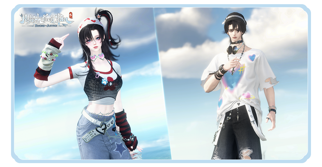 Bộ ngoại trang không được tạo nên để gò bó người mặc trong khuôn khổ chỉnh tề hay chuẩn mực an toàn. Áo phông rộng với họa tiết loang màu tự do, quần jeans phá cách mang dấu vết của chuyển động và thời gian, kết hợp cùng phụ kiện kim loại, dây xích và tai nghe, từng chi tiết đều mang theo hơi thở của những ngày dám mơ, dám cháy và dám sống trọn vẹn.