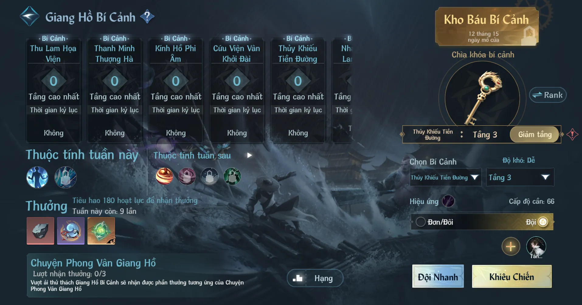 Giang Hồ Bí Cảnh có thể xem là phiên bản tiến hóa vô tận của “Chuyện Phong Vân Giang Hồ”. Đương nhiên, phần thưởng cũng phong phú hơn. Đây là cơ chế phó bản PVE dạng thách đấu theo bậc, dựa trên 6 phó bản của Chuyện Phong Vân Giang Hồ, chia thành 15 tầng độ khó khác nhau.