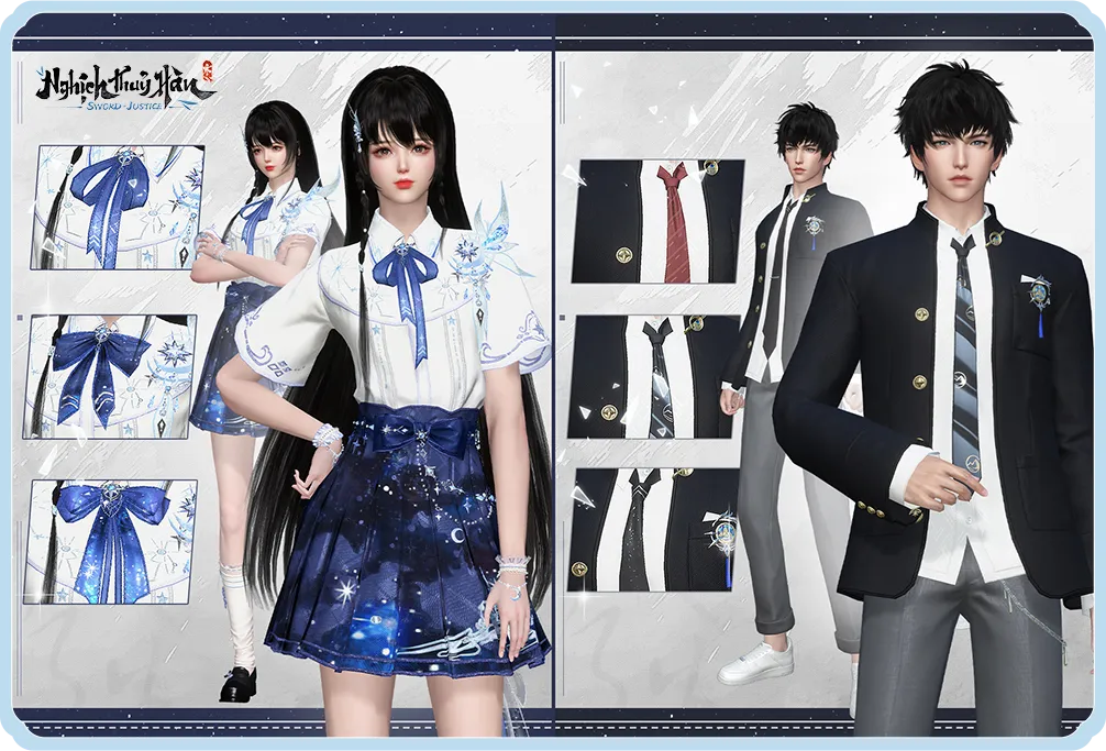 Bên cạnh đó, bộ ngoại trang này còn có ba kiểu cắt may để bạn tự do lựa chọn! Người chơi có thể thay đổi kiểu dáng nơ hoặc cà vạt, phối hợp tự do giữa ba mẫu thiết kế - tùy chọn đa dạng với giá trị cực cao!