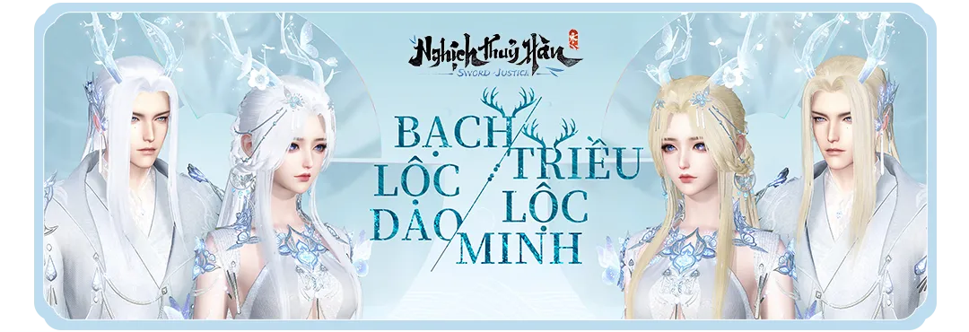 Song hành cùng ngoại trang là kiểu tóc hiếm Bạch Lộc Dao/Triều Lộc Minh, mái tóc dài đổ xuống vai, kết hợp cùng sừng lộc phát sáng và trang sức băng lam. Có thể mua bằng 1 viên thiên thưởng trong cửa hàng