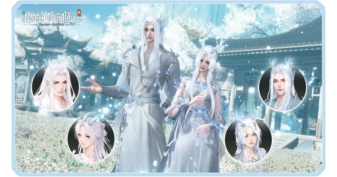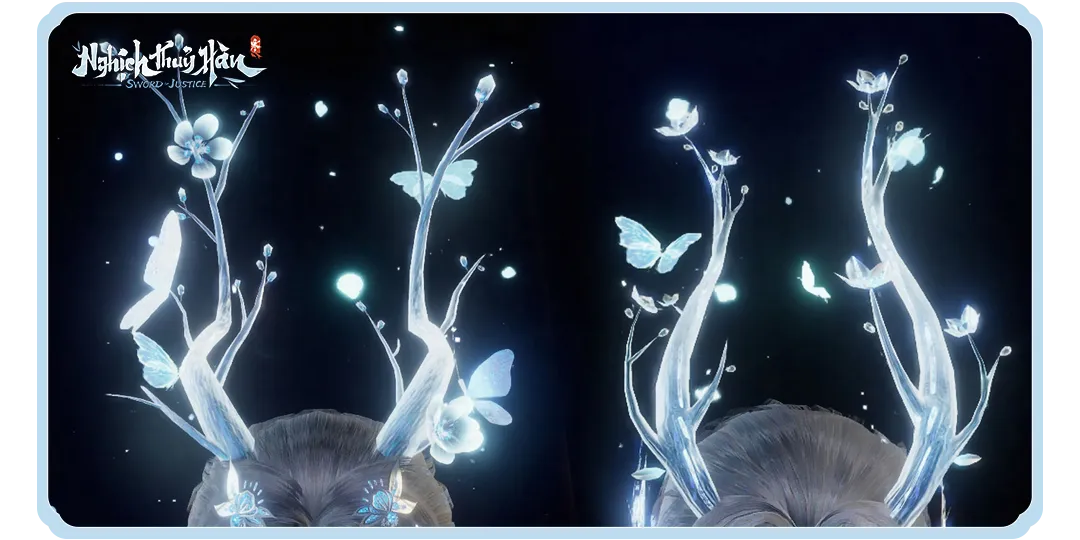 • Phụ Kiện Đạp Toa Hành: Sừng Linh Lộc tinh xảo trên mái tóc, Được tạo hình như nhành cây ngọc nở hoa, điểm xuyết bướm trắng và ánh sáng dịu nhẹ.