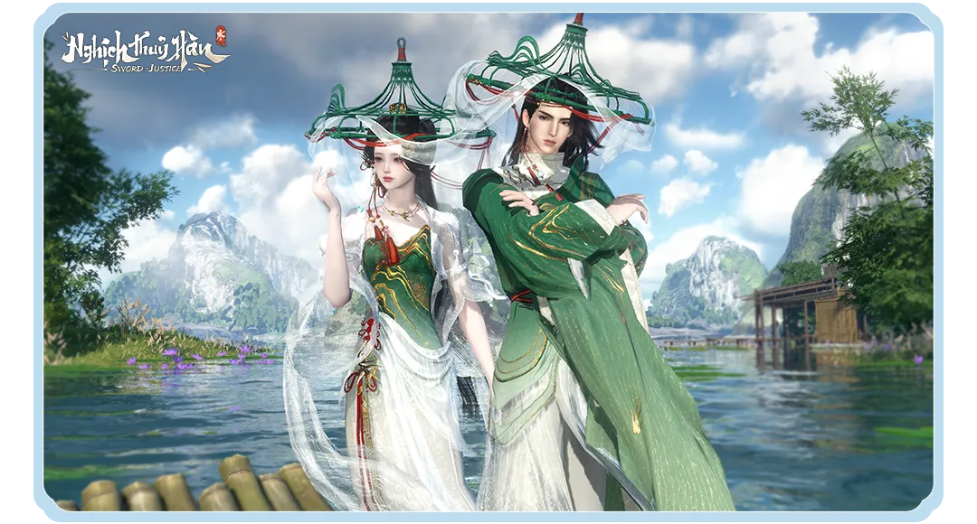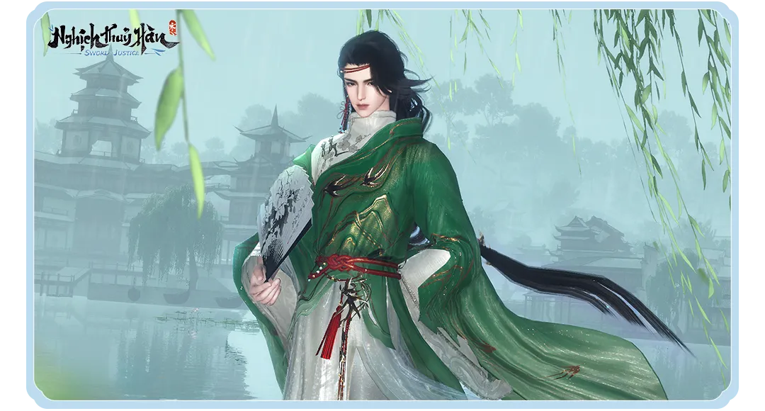 Sự kết hợp giữa lụa trắng thanh khiết và sắc xanh trầm ổn khiến tổng thể trang phục vừa tao nhã, vừa mang nét phong vận của những bậc ẩn sĩ giang hồ.