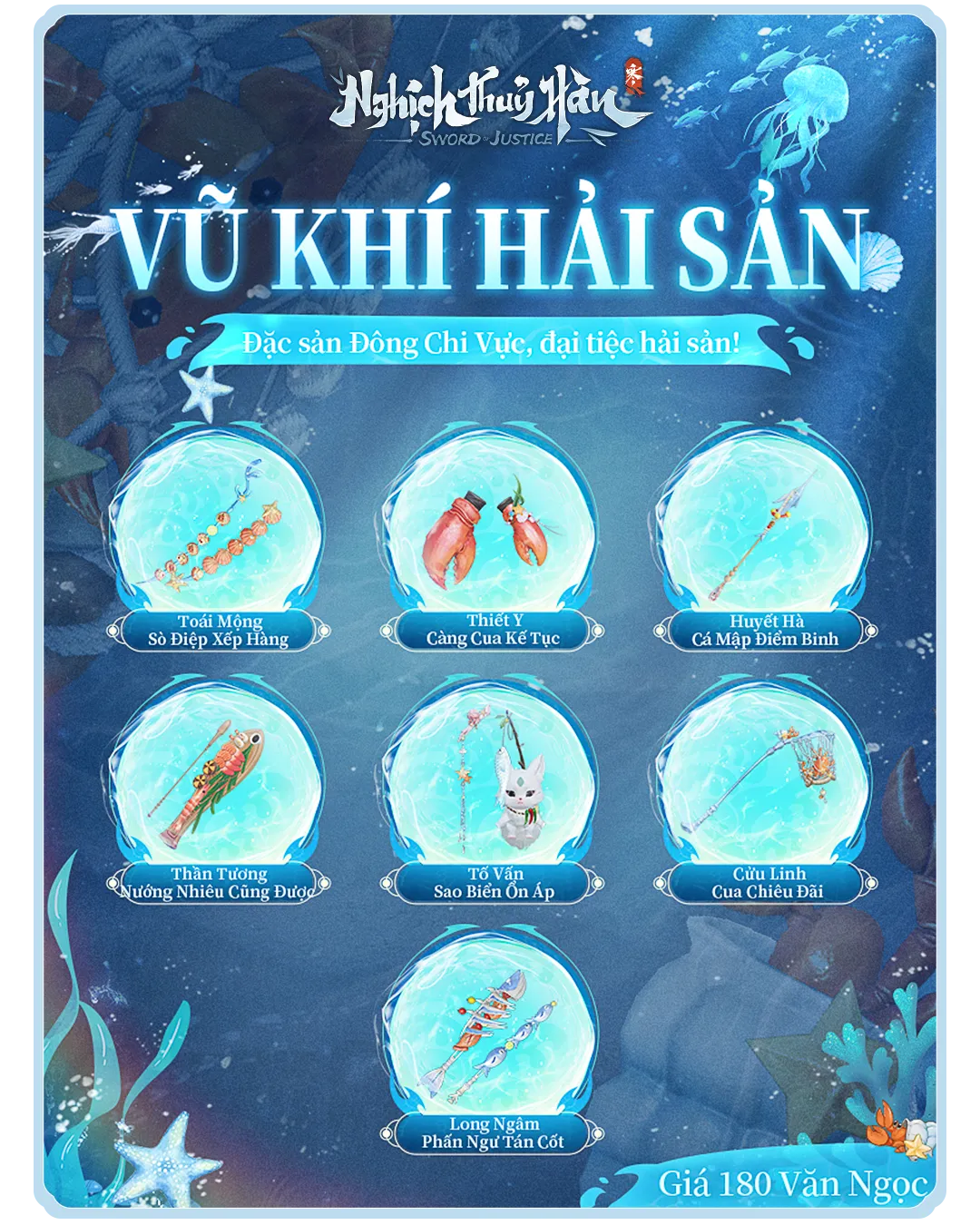 Ngoài ngoại trang, bản cập nhật lần này còn mang đến bộ skin vũ khí chủ đề Hải Sản, đậm chất vui nhộn của vùng Đông Chi Vực.