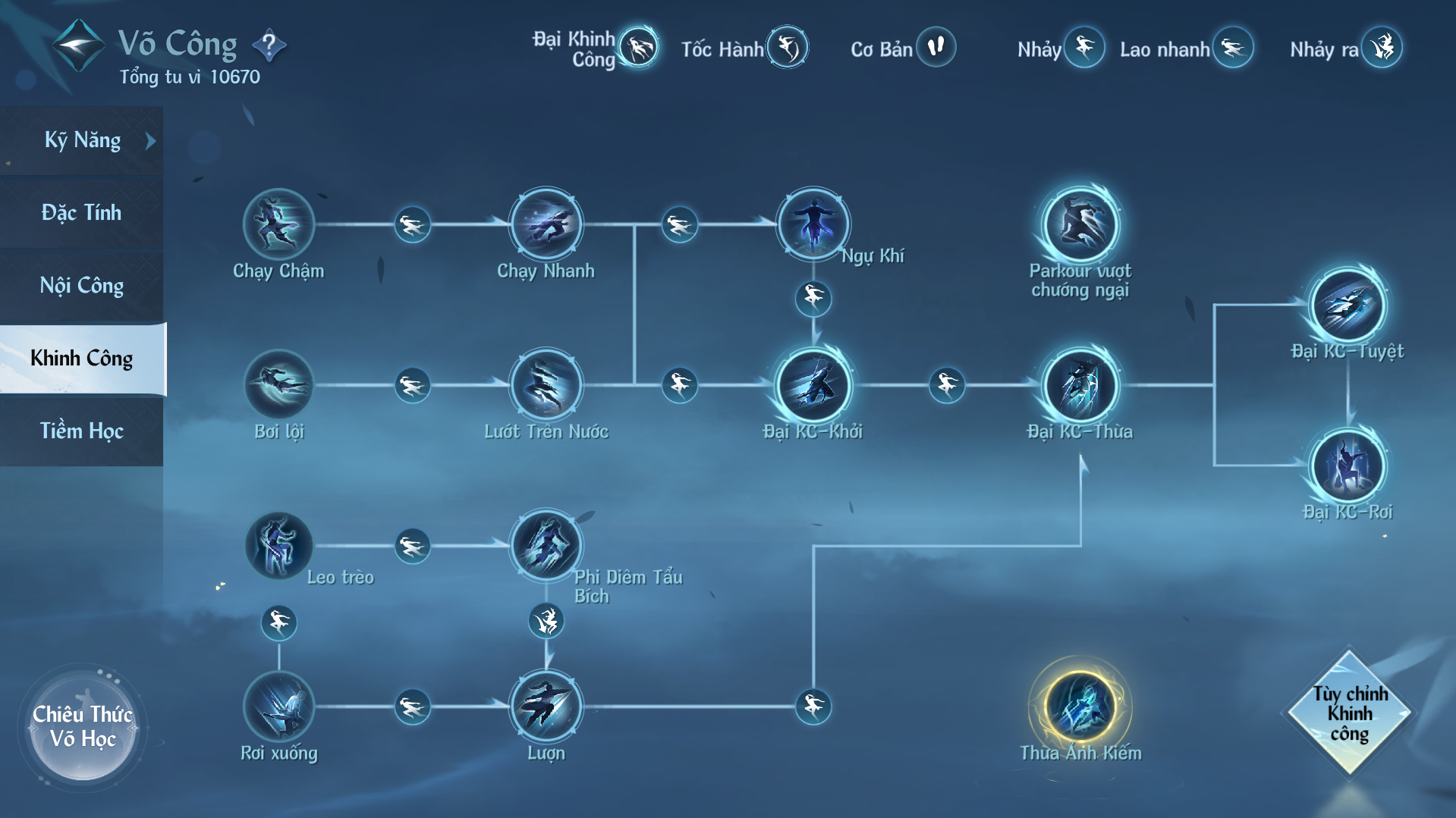 Căn cứ theo các tình huống sử dụng, hệ thống khinh công được chia thành ba mảng: