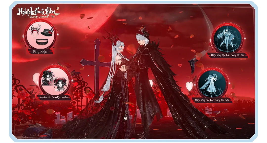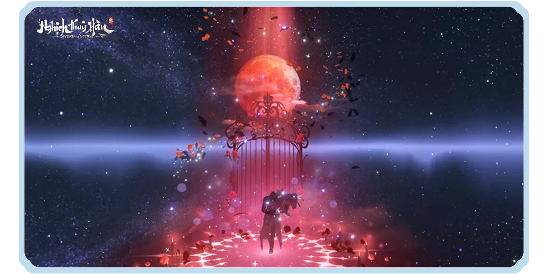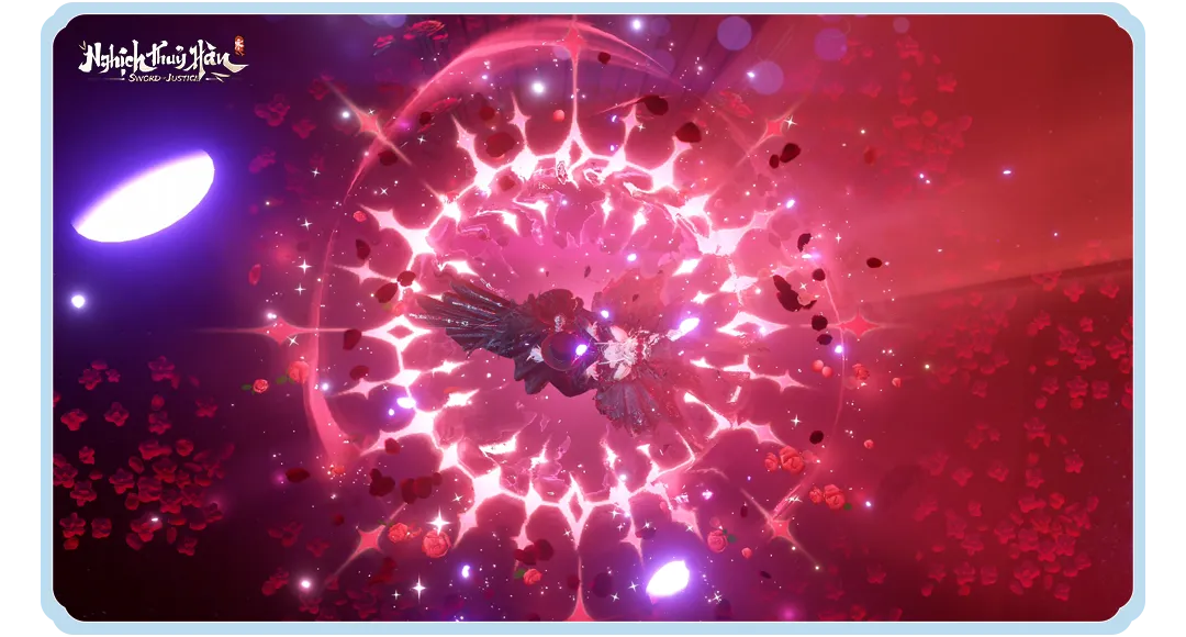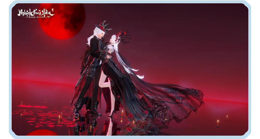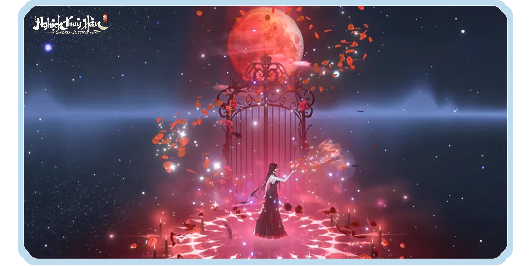 • Động tác đơn – Lời Mời Trăng Bạc – trăng đỏ giáng xuống, cánh cổng bóng đêm mở ra, hoa hồng xoay tròn giữa pháp trận huyết sắc.