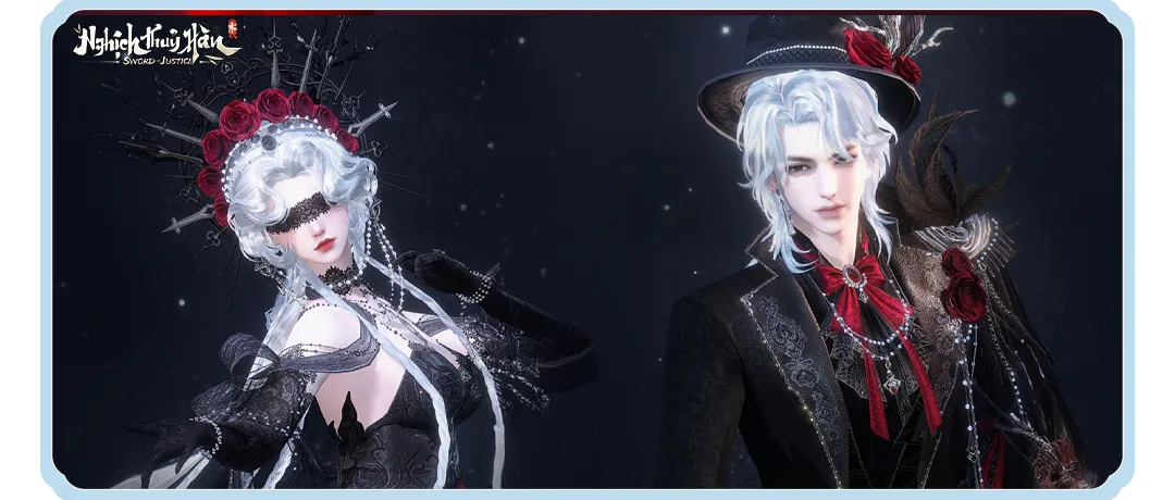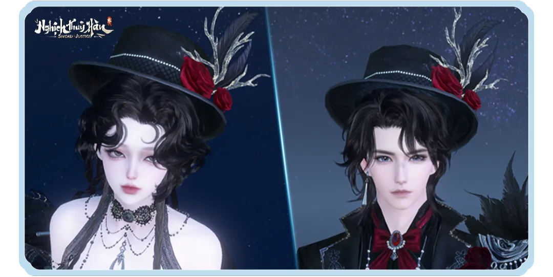 • Huyết Yến Gia Miện – mũ quý tộc đính lông vũ và đóa hồng thẫm màu, lịch thiệp nhưng ẩn giấu nét nguy hiểm khó lường.