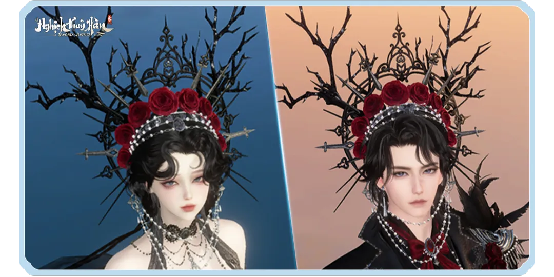 • Dư Hồng Sức Dạ – vương miện gai nhọn đan xen hoa hồng đỏ, tựa hào quang của nữ vương bóng tối, kiêu sa mà đầy cảnh báo.