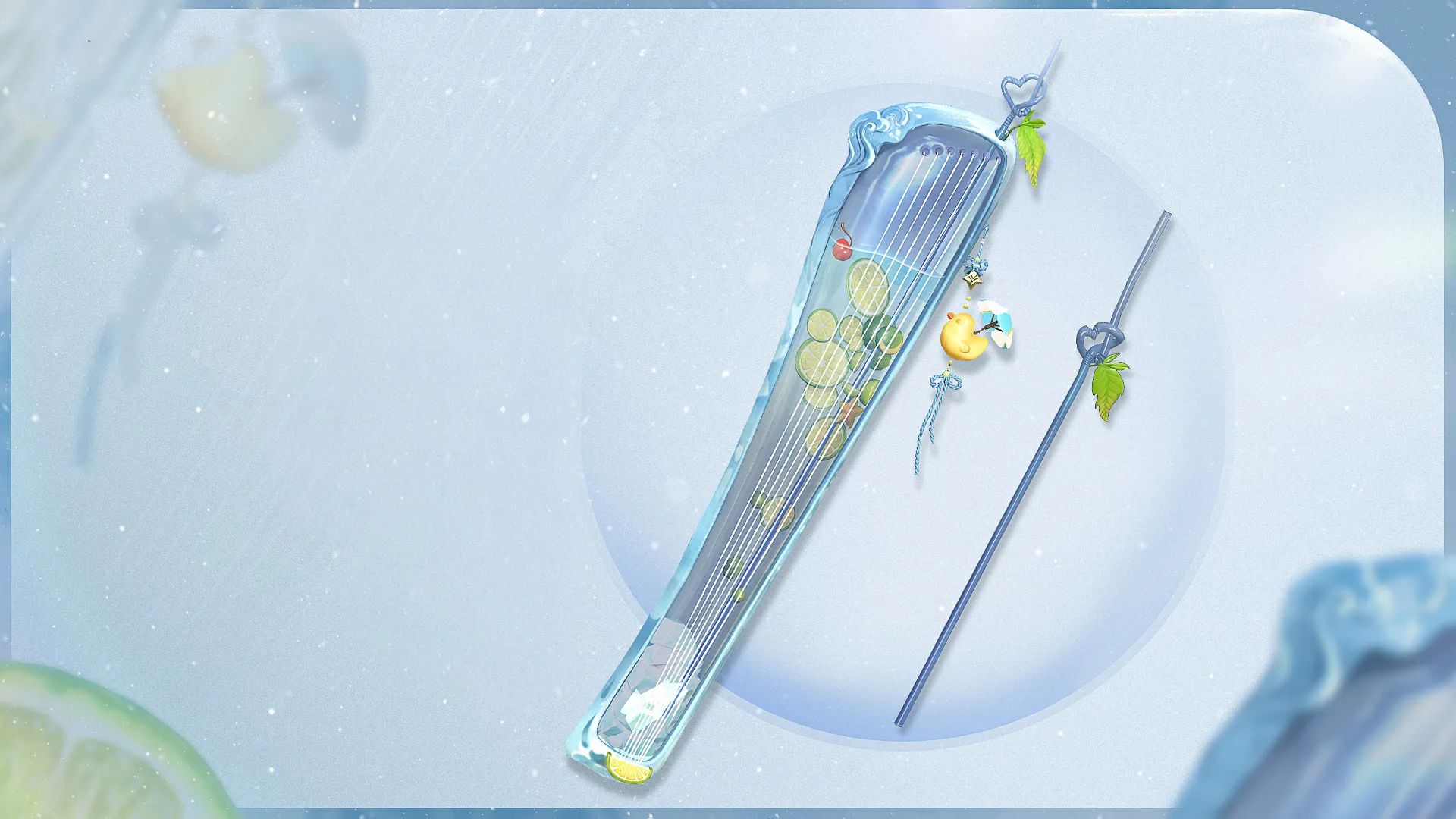 Vũ khí của Thần Tương gọi là Trà Chanh Giã Tay, biến thành một ly trà chanh size cực đại thêm thật nhiều đá, còn có lá bạc hà, ống hút trái tim, thậm chí thêm cả chú vịt vàng đang đi nghỉ mát! Khi chạy, phần nước ở giữa còn đong đưa theo trọng lực, cảm giác nhìn một cái là thấy nguyên một ly trà chanh mát lạnh!