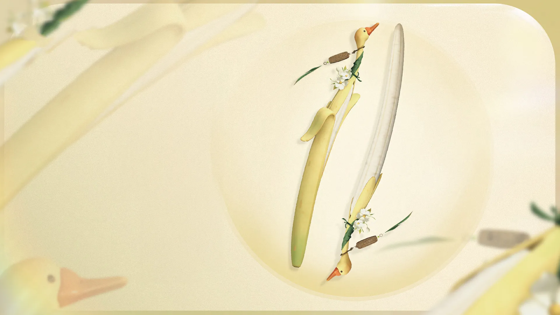 Đao của Toái Mộng gọi là Chặt Chuối Cả Nải. Nhìn xa thì như một quả chuối to tươi mới, nhìn gần lại là chú vịt vàng đang ngửa mặt kêu trời! Trên bảng treo của vịt vàng đang nhắc mọi người: thay vì đầu bù tóc rối, chi bằng vui vẻ bỏ mặc đời, với Nghịch Thủy Hàn, vui là quan trọng nhất!