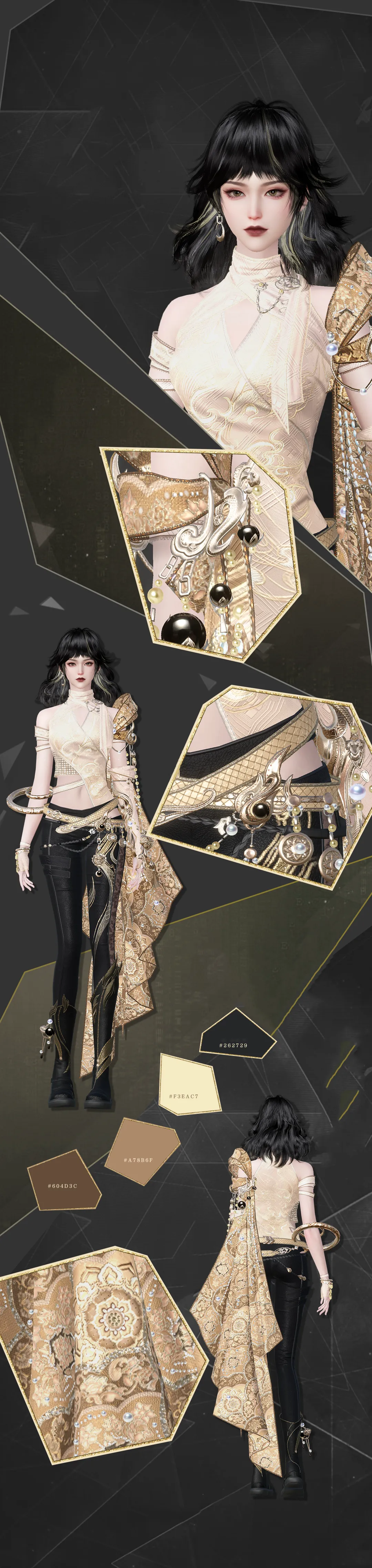 Thời trang nữ Tứ Hành Vô Câu mang phong thái mạnh mẽ, gây ấn tượng ngay từ cái nhìn đầu tiên. Áo khoác dùng tông màu đất làm chủ đạo, kết hợp nâu đậm, vàng camel và vàng nhạt, đều là những gam màu ấm. Quần sử dụng sắc đen trầm ổn để tạo nền, chuyển tiếp bằng họa tiết rồng thêu vàng nhạt. Khi đi cùng áo choàng, tổng thể toát lên vẻ dứt khoát, mạnh mẽ.