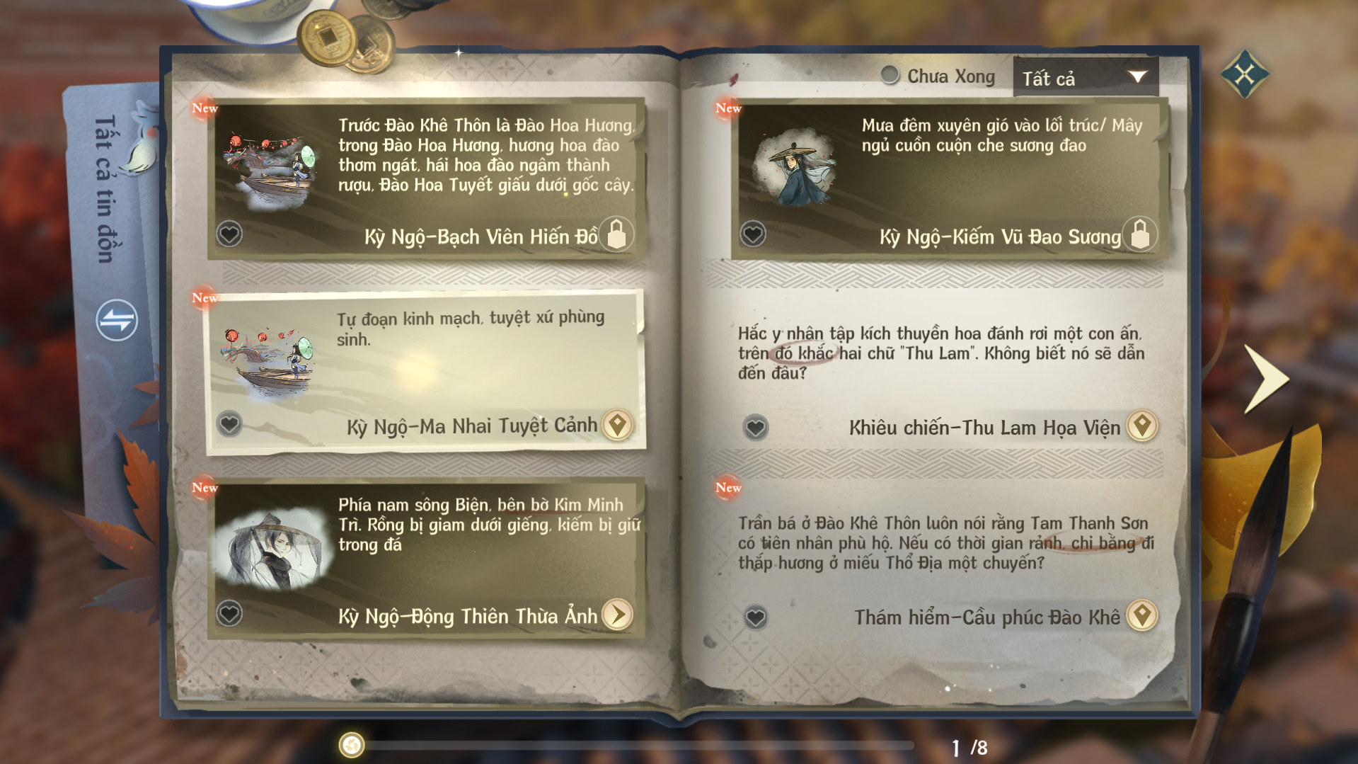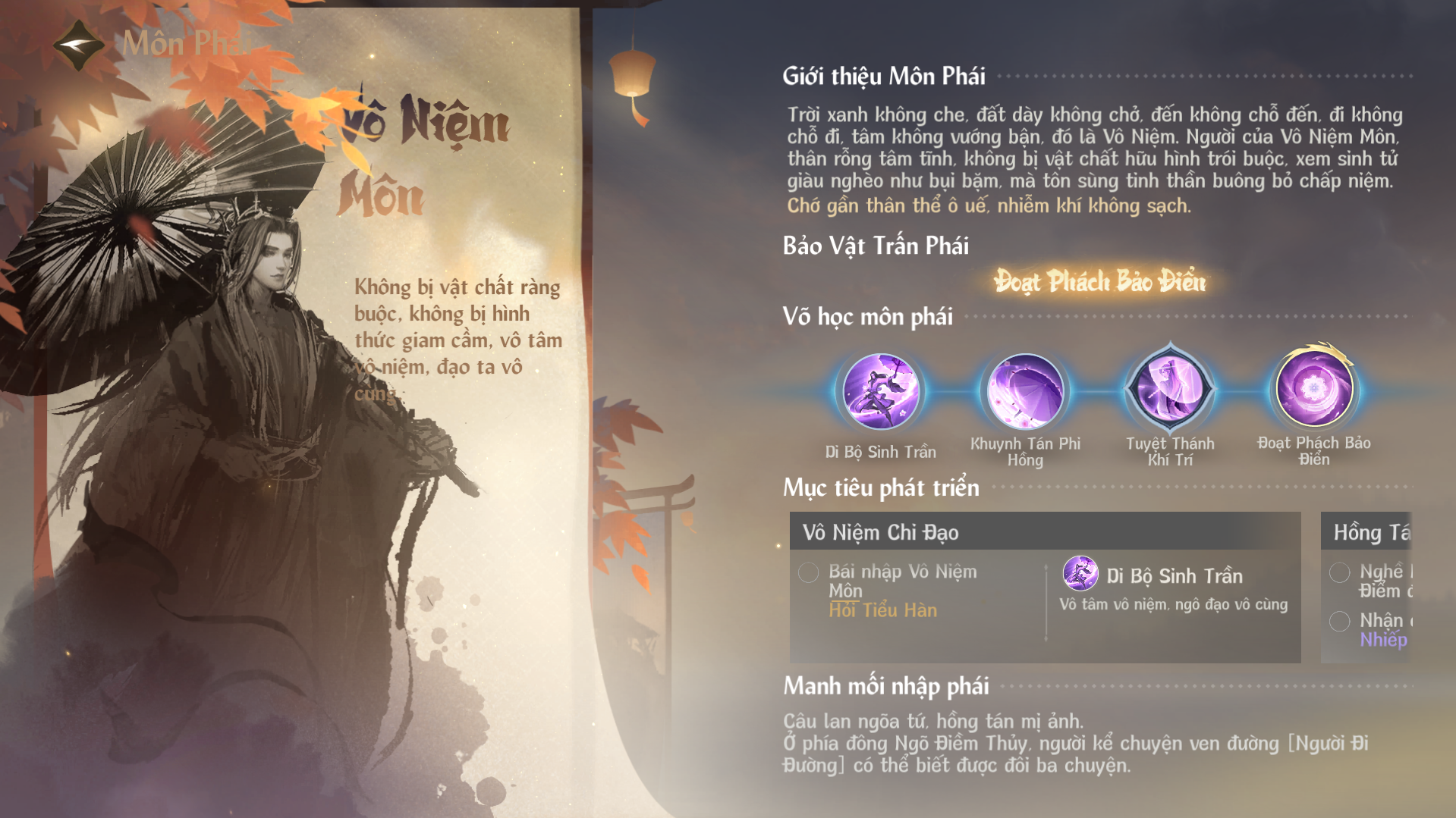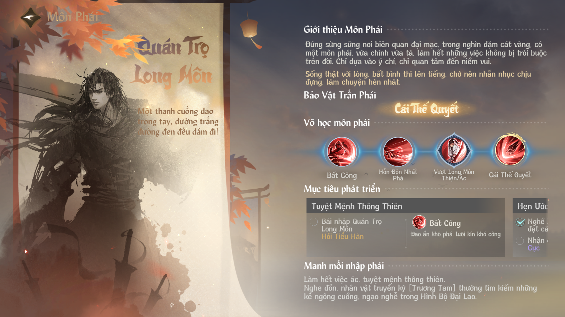 Đừng lo. Trong giang hồ luôn có các Bách Hiểu Sinh, những người tổng kết truyền thuyết bí ẩn về võ học. Chỉ cần kích hoạt, bạn sẽ nhanh chóng tìm đến địa điểm cần thiết. Ngoài ra, nếu đã để ý kỹ năng nào, bạn cũng có thể trực tiếp xem cách nhận ngay trong phần mô tả bên dưới.