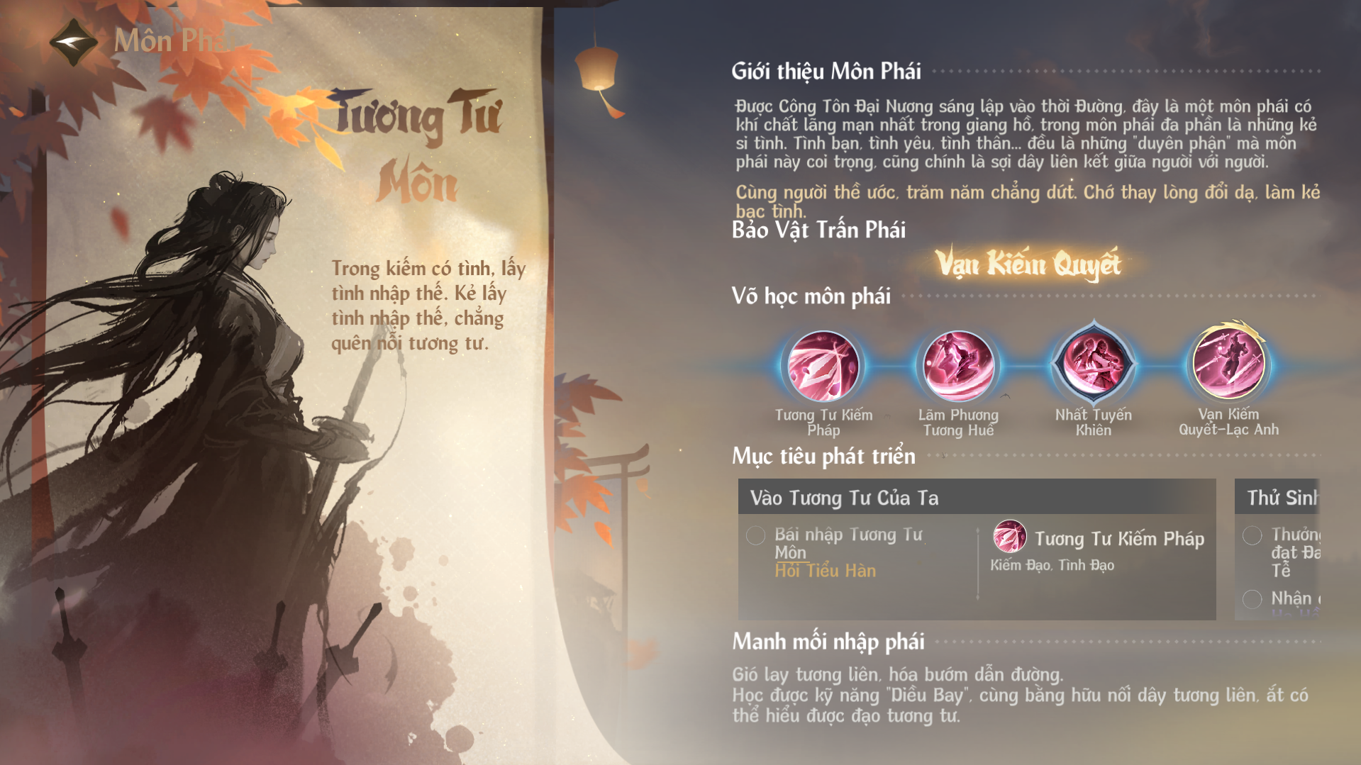Tình cảm đôi lứa tuy sâu nặng, nhưng cũng không thể lúc nào cũng ở bên nhau. Do đó Tương Tư Môn cũng cung cấp cho đệ tử kiếm pháp cường lực dành cho đơn đấu Vạn Kiếm Quyết - Lạc Anh! Trong chiến đấu có thể kiếm ý hoá thực, công kích địch thủ bằng truy kích; khi đối diện với kẻ địch đông đảo, còn có thể ngưng tụ kiếm ý bay khỏi mặt đất, tạo thành hiệu quả không chiến khiến người ta kinh ngạc.