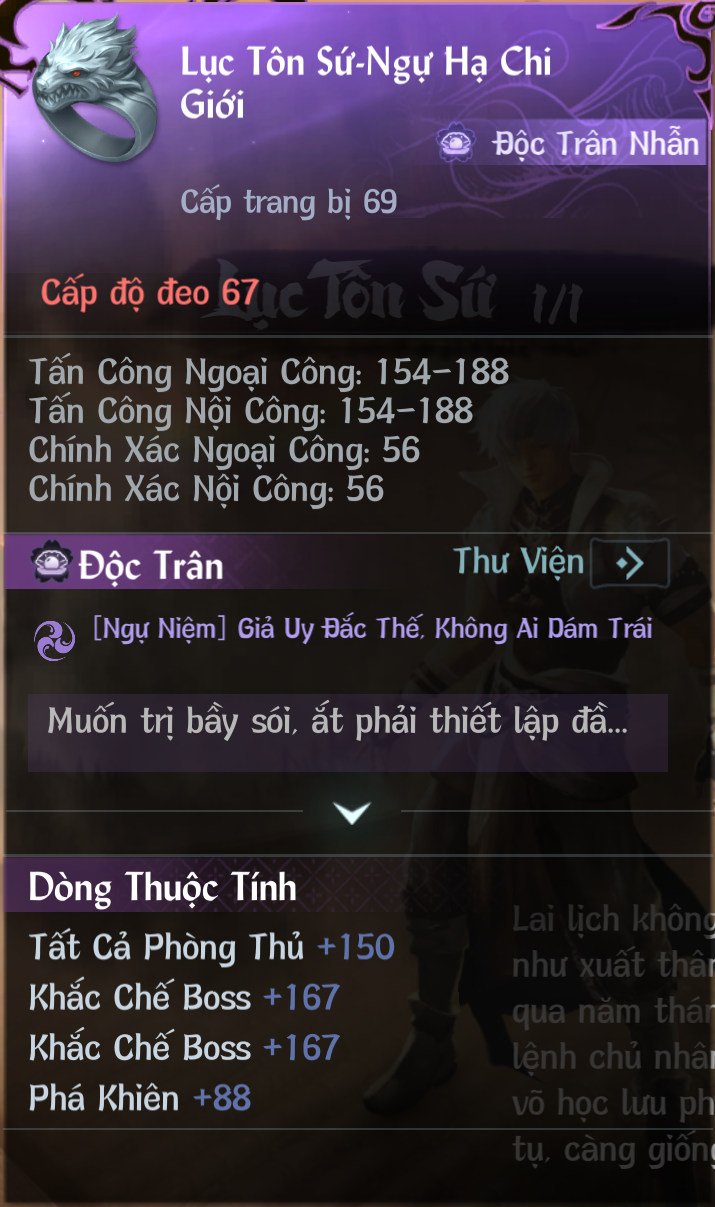 Người chơi có cơ hội nhận được nhẫn Lục Tôn Sứ · Ngự Hạ Chi Giới được khắc đầu sói. Chiếc nhẫn từng được dùng để điều khiển dược nhân, và người sở hữu nó cũng có thể trải nghiệm cảm giác áp chế người khác theo ý mình: gây sát thương cao hơn và khống chế tốt hơn với các mục tiêu cố gắng thoát khỏi kiểm soát, đặc biệt hiệu quả với kẻ địch có độ cơ động cao.